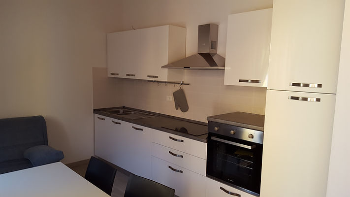 Cucina moderna con piano cottura a induzione forno e microonde.